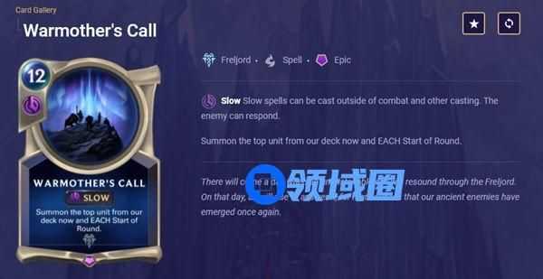 这套牌的致胜思路很简单,就是最终依靠12费的强力法术Warmother's Call(战母的召唤)不断将己方单位从卡组中拉入场内形成场面压力和资源优势。