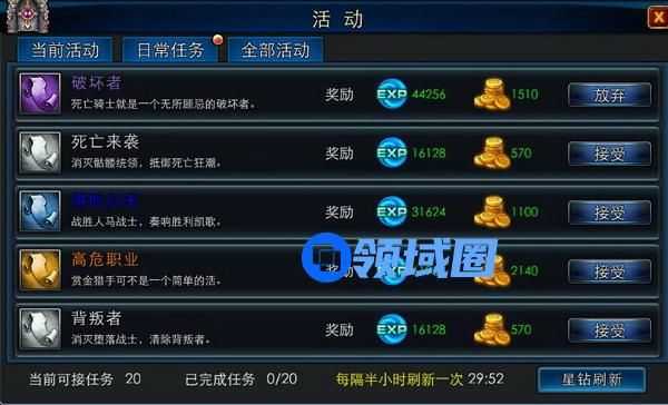 日常任务每30分钟刷新一次或者使用星钻可以直接刷新(土豪求放过)