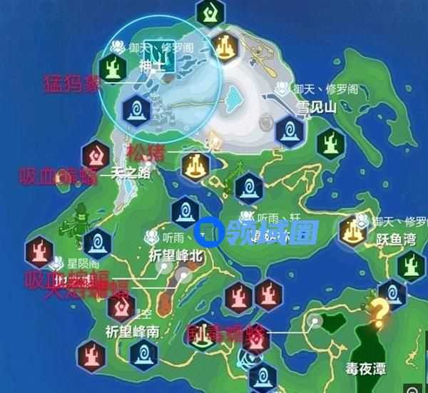 通过上图可以看到,火焰蝙蝠的刷新位置是在祈望峰,除此之外,我们还可以了解到其他一些宠物的刷新点,具体如下: