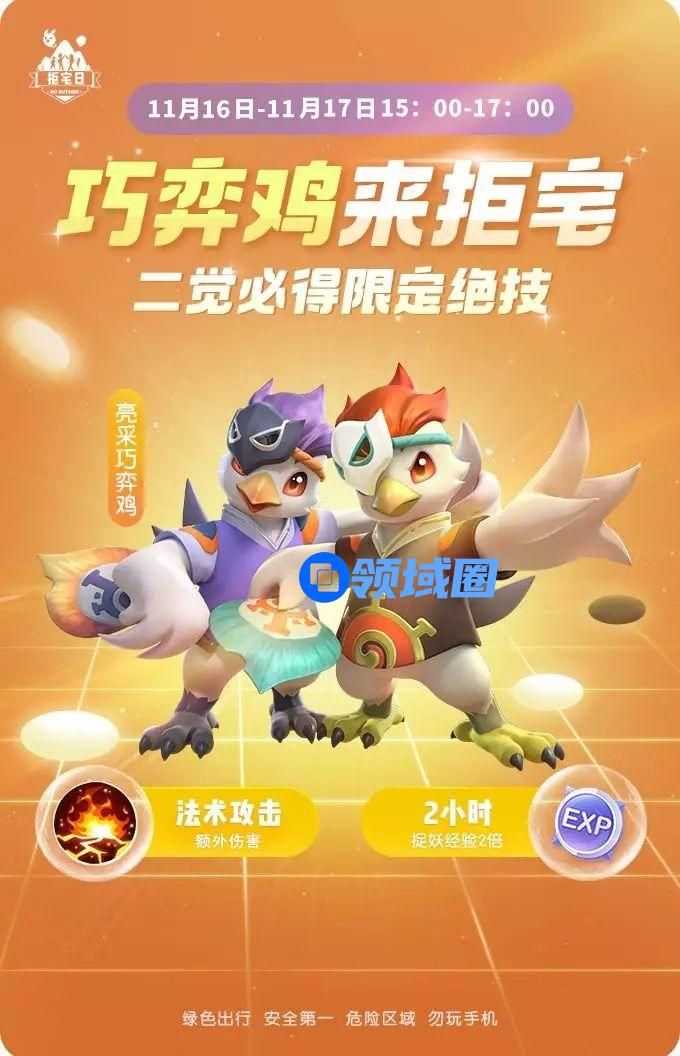 一起来捉妖本周六开启新一轮拒宅日活动,本轮拒宅日期间玩家可以在活动地点捕捉限时出现的巧弈鸡,在指定时间内完成巧弈鸡的觉醒,将其觉醒至昴日鸡还可以获得限定绝技-奇袭!