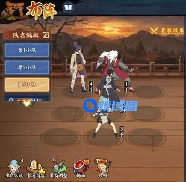 自来也1号位起手可提供减速,自来也、天天、水主同一竖排触发水主被动“淬毒”。天天可起手释放奥义,鸣人作为队伍的辅助.