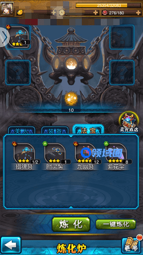 炼化炉炼化法宝/碎片:在少年们已经不需要培养新法宝时,可将夺宝、军功商店兑换而来的法宝/碎片直接在炼化炉炼化获得法宝精华。