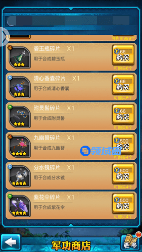 军功商店中初始出售各三星法宝碎片,使用军功即可兑换法宝碎片。每日可兑换法宝碎片的数量有限,需要少年们每日积累才能合成完整法宝哦。