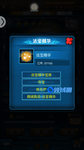法宝精华获得途径:活动宝库之法宝精华宝库、夺宝、精英副本、试炼商店购买、商城购买直接购买、炼化炉炼化法宝/碎片。
