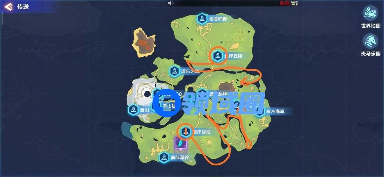 和水栖兽的传送起点一样为——南岸谷地,跟着箭头绕那个山谷一圈,从山谷进去,从旁边绕出来,没有就去跑图上方,本人跑的为圆圈标记点,中间的方形标记点应该出现概率比上方点的要高,但是不想跑,毕竟鹿我只是顺手抓的,本人从未在上图的那个点抓到过,鹿全部是在山谷那里抓的,即1号点。