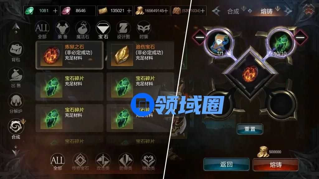 (2)1级、2级宝石不能通过熔铸获得宝石碎片,需要先在背包内合成3级或以上的宝石才能熔铸。