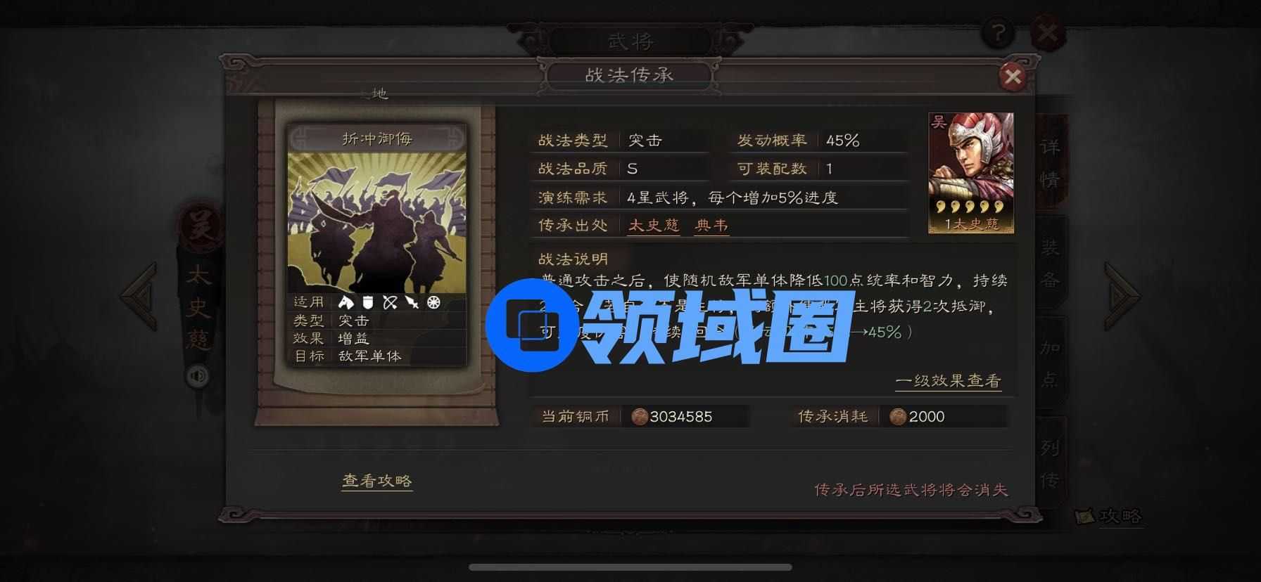 三国志战略版折冲御侮战法是突击战法,传承出自太史慈和典韦,该战法普攻之后可以降低敌军的统率和智力,并且还有特定状态下的免疫伤害效果加成,一起来看看突击战法折冲御侮吧。
