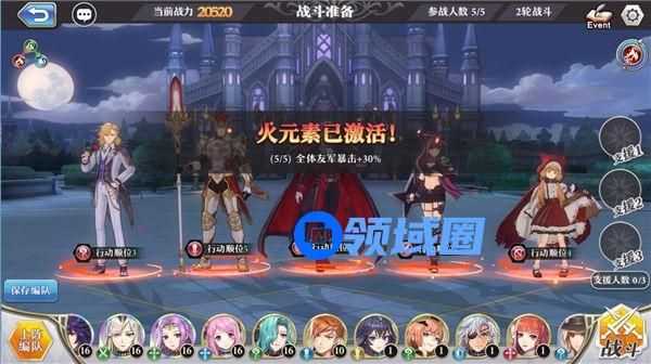 各元素的加成效果为:火(全体暴击)、地(全体格挡)、水(全体闪避)、光(全体减伤)、暗(全体增伤)。