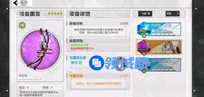 解析:造成伤害能附加目标最大生命值的真实伤害,是高频输出的强力武器,但装备要求有点苛刻,要五星70级的驱动者,这是唯一美中不足。专武技能可以使神月羽高概率额外射出四发箭矢,高抛玩家的福利,当然普攻也能触发,使神月输出更上一层。