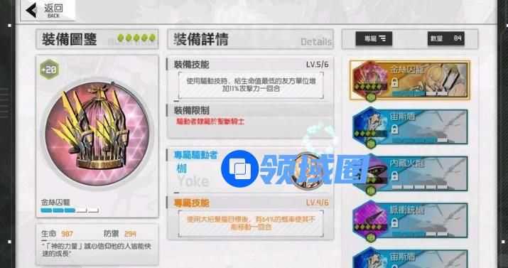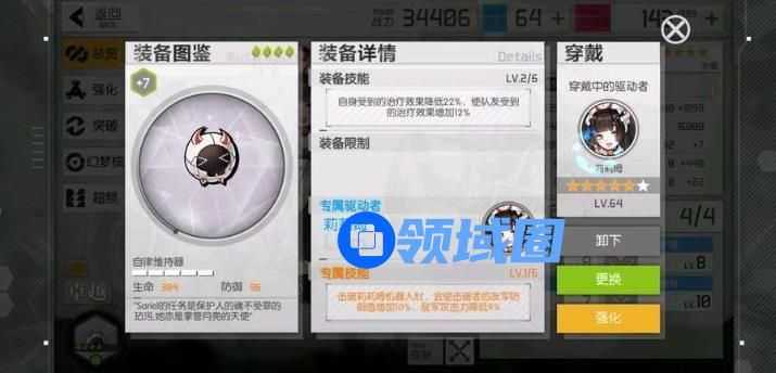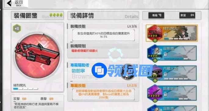 解析:虽然是件四星装备,但效果不差。用自身受到的治疗效果降低换友方受到的治疗效果增加,是一个有代价的辅助技能。专武技能是击破莉莉姆的机器人时会使击破者方的防御上升对面攻击下降。可能有点不好理解,概括来讲就是自己的机器人自己打,别被敌方打。这件专武是一把双刃剑,但由于增益效果可以无限叠加,运用得当是一件强力的武器。