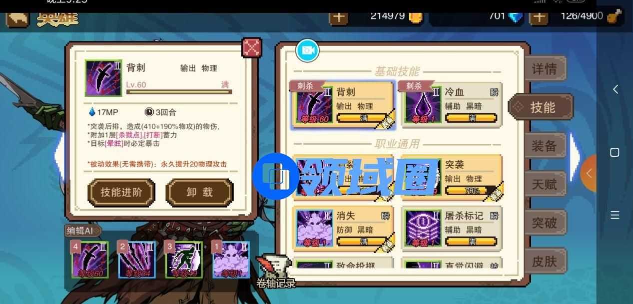 暗影伏击:突进技,技能可选择前中后排的单体敌人,相比背刺会灵活,但爆发不如终结技。要使用的话BUFF技能不建议带消失配合。虽然暗影伏击可以在潜行状态+20%伤害,但该技能升级为三阶技能乃至四阶技能,潜行+20%伤害的说明仍然固定。