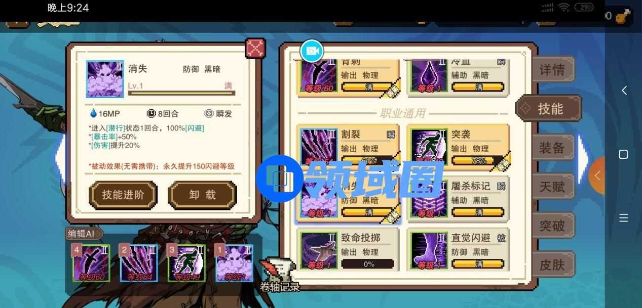 消失:防御瞬发技能。在潜行状态时100%闪避可以闪避任何敌人的普攻和技能伤害,但是无法闪避控制技能的控制效果,同时该“潜行”状态可以被驱散。一方面是保命,一方面是提高伤害,双重功能在刷图的时候能更好的配合。就我个人而言,如果是组队副本没法组到玩家(不是电脑)进去可以用更好配合的阵容,如果是单刷匹配两个电脑队伍的,可以考虑刺客带消失,降低被秒的概率。