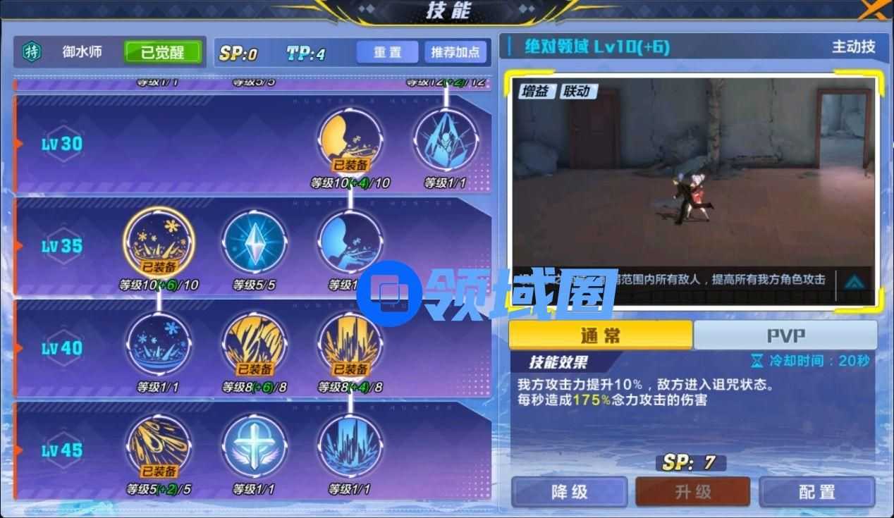 在任何先手技能命中之后最好都要秒接一个绝对领域再进行连招,这个技能可以增加10%攻击力,并且没有引导动作。如果对方在绝对领域范围中还可以降低对手15%攻击力和20%全属性,是一个非常强力的技能。