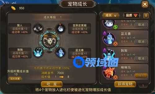 3、宠物的成长,有一定的成功率,成功率由所有消耗的宠物的品质决定。