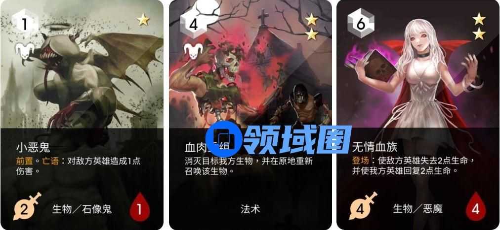 作为恶鬼的迷你版,小恶鬼在身材上明显是小了一号,但多的前置效果让你在快速的二线进攻以及对付一些远攻角色上灵活不少。能够触发亡语及登场效果的血肉重组,在这付牌组中能够搭配几乎是没有搭配不了的生物存在,死一次不够? 那就死两次吧!无情血族的进场效果配上蕾比堪称绝配,进场的直接伤害与回复血量,能够帮助蕾比在英雄技能的转换下能仍维持着一定的血线,确保生物战的优势面。