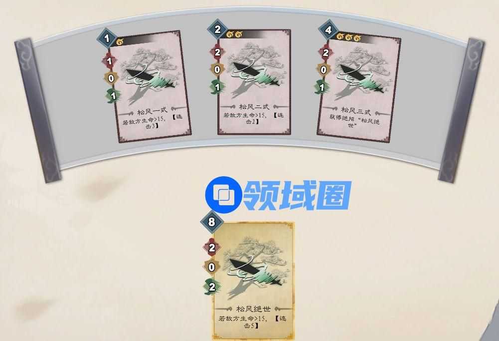 松风剑法绝招【若敌方生命>15,连击5】,而庖丁刀法绝招【若敌方生命《15,攻击+5】,一个针对生命>15,一个《15,全方位打击,使用起来也是非常简单,那就是敌方血量高的时候使用松风压低血线,血量低的时候使用庖丁斩杀。