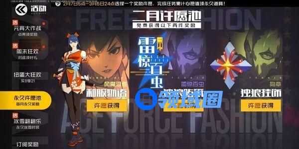 玩家可以从永久时装风魔忍者·和服物语(奖励30个时装碎片可激活1星时装)、永久贴纸独狼·雷惊百虫、永久饰品独狼·勋章三个奖励选择两个作为愿望免费获得;