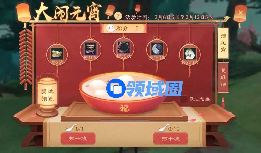 活动介绍:桂花香馅裹胡桃,江米如珠井水淘。元宵佳节,不来一碗热腾腾的元宵怎么行?美味入口,福利也请带走~参与大闹元宵活动,使用琉玉金匙捞取“元宵”有概率获得元宵节限定时装等稀有道具奖励!每次捞取汤圆必得元宵活动积分,消耗一定数量的积分还可兑换元宵节专属头像框、家具等稀有道具哦!