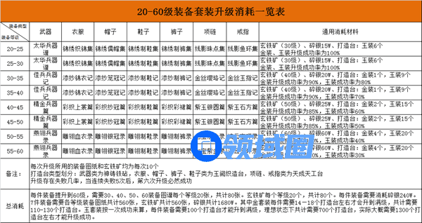【20-60级套装升级消耗一览表】