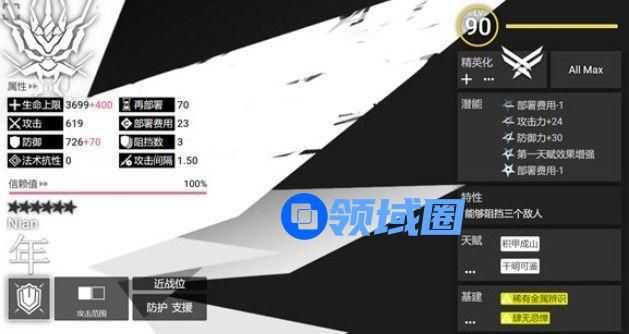 第一天赋积甲成山能够在编入之后提升全体重装的属性,而第二天赋干明可鉴则是在部署后赋予自身三次抵挡伤害的护盾。
