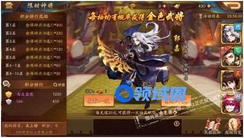 限时金将活动开启,少年们可以点击主城界面右上的icon参与,进入主页面之后,可以选择使用金将令进行单抽/十连抽!