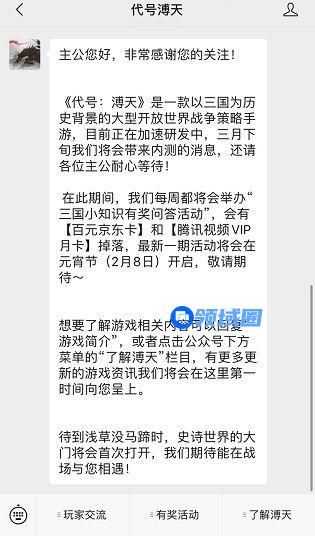 对三国题材的此作感兴趣的玩家建议关注代号溥天的微信公众号,其应该会是各种官方最新情报的重要公布场合,根据公众号消息,三月下旬将会有关于内测的消息,但这并不意味这是在三月开测,可能只是在三月告诉玩家大致何时能够开测,而且目前不排除会跳票的可能性。