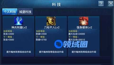 2、城堡科技为服务器共有,城堡统帅才能够升级,本服所有玩家都可以享受加成。