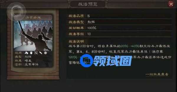 济贫好施 指挥 战斗第2回合时,将自身属性的20%→40%移交给兵力最低友军,第4、6、8回合时,恢复我军兵力最低单体(治疗率120%→240%,受智力影响)或是使敌军兵力最高单体造成伤害降低21%→42%(受智力影响)。