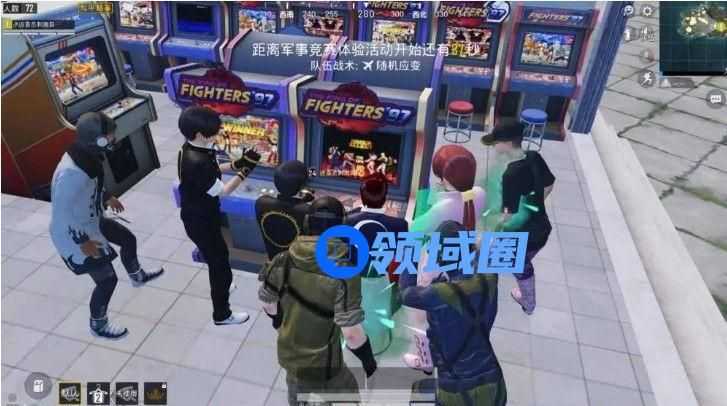 玩家们在等待开始游戏的时候,可以观看八神庵和草薙京在游戏厅里打游戏。在跳伞倒计时中,很多玩家聚集前往,围观八神庵和草薙京玩游戏的一个场景。在他们的身边,吸引了很多玩家在旁边驻足围观。