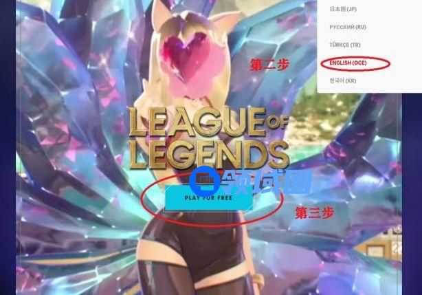 点击右上角的地球选择下拉菜单中的OCE(大洋洲服务器)。点击屏幕中间的play for free 开始注册大洋洲服务器拳头账号。