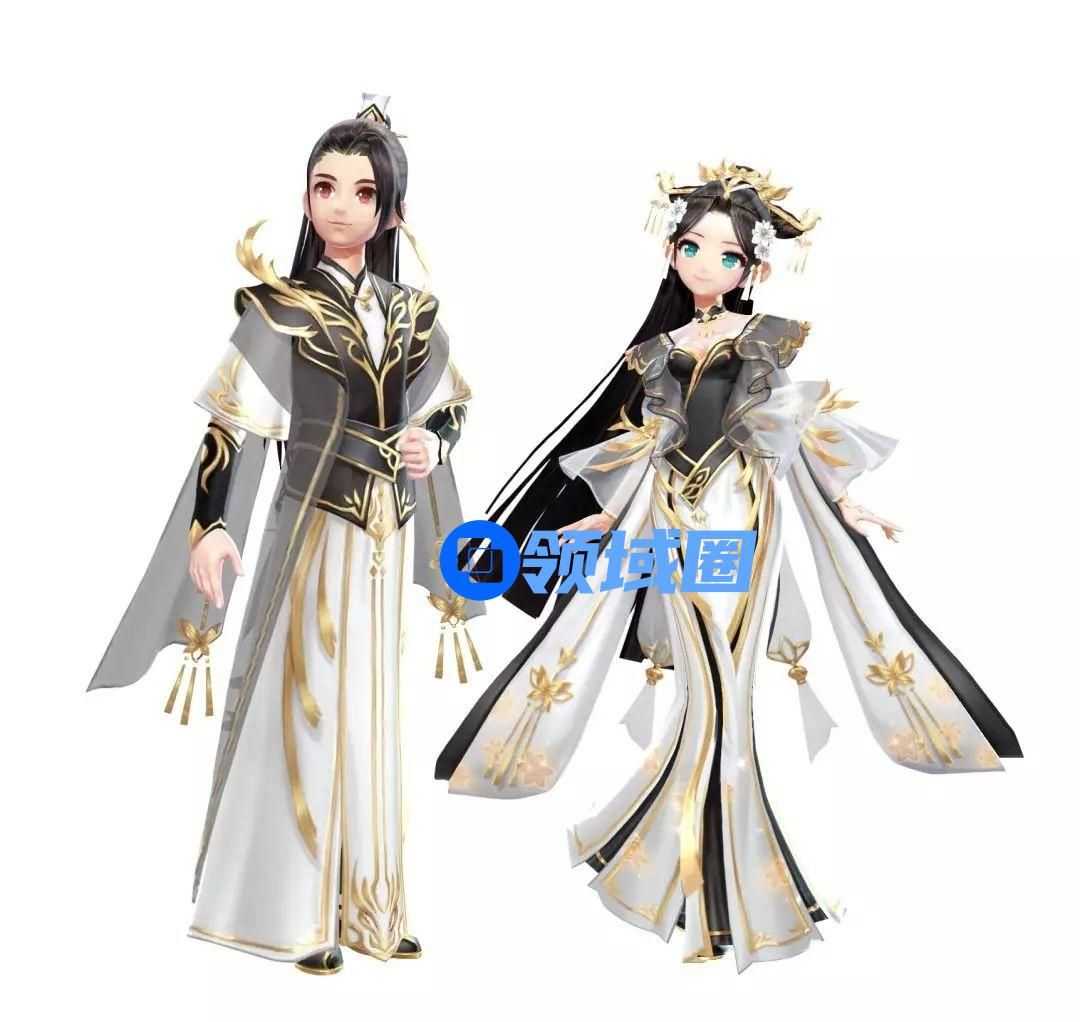 男装白色的缎面丝绸与金丝制成如玉长袍,披上玄色外袍,增添了些许神秘感;女装金丝交织的黑白长裙,勾勒出妙曼身姿,犹如花间仙子。