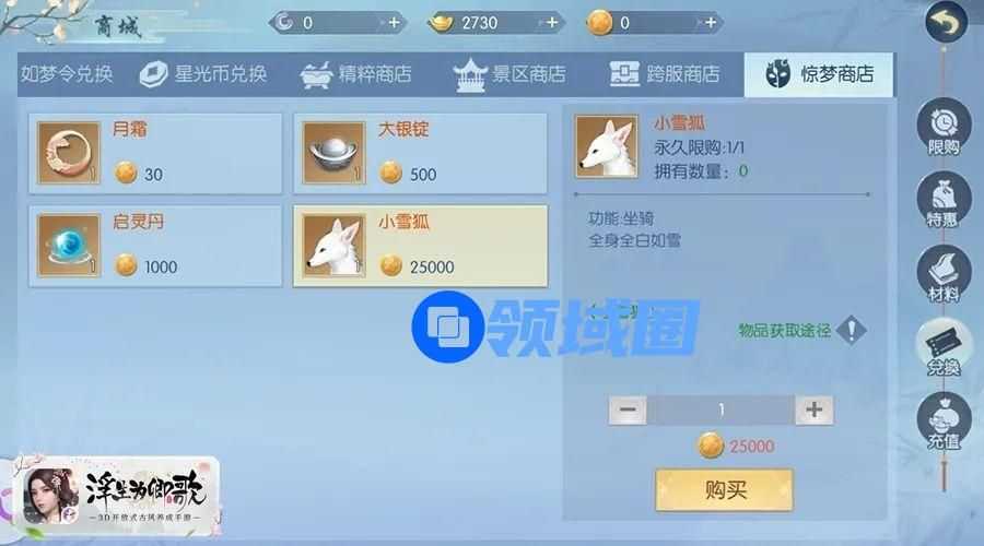 每次成功挑战,均可获得梦境币等奖励,梦境币可在惊梦商店兑换启灵丹、小雪狐坐骑等丰富奖励!