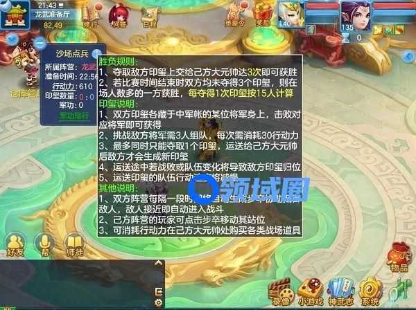 在敌方阵中,将有三位将军出阵迎战,而“印玺”便藏在其中一位身上,锁定目标后击败将军即可获得印玺。成功把敌方印玺带回己方大元帅处上交可以为联盟增加大量军功!