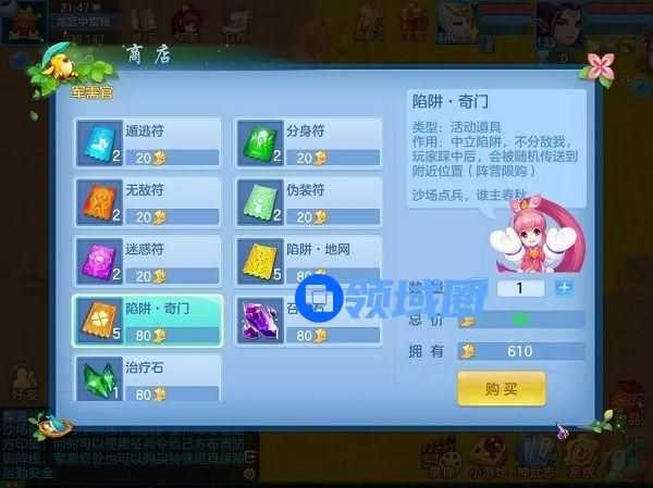 同时,为了让自己争夺印玺的过程更顺利更加有趣味性,少侠们还可在己方的大元帅处,用行动力购买不同道具,通过合理使用道具来应对各种复杂局势。