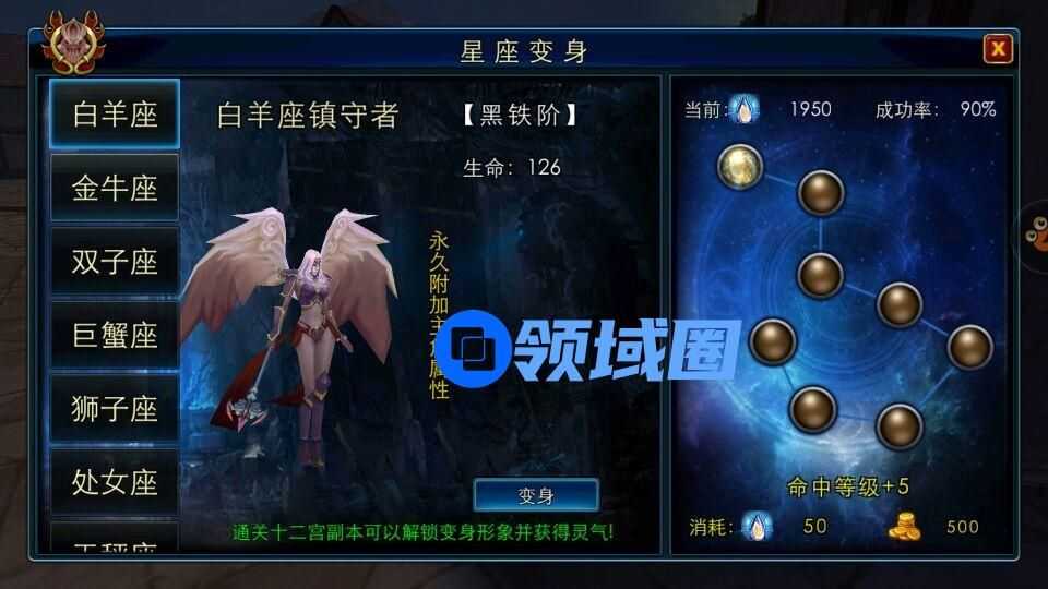 十二宫副本,就是分别挑战十二星座,每挑战成功一个星座,就可以变身成对应星座。每天挑战还可以获得灵气的奖励,每个星座每天可以挑战一次,如果成为VIP之后可以直接扫荡打过的星座。