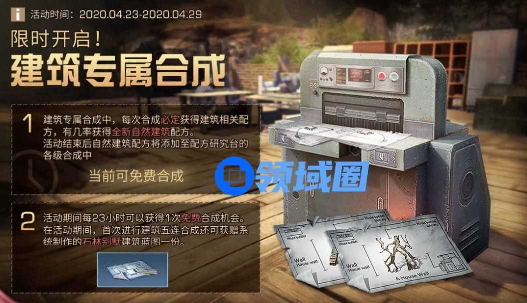 活动介绍:4.23~4.29期间,建筑专属合成中每次合成必定获得建筑相关配方,有几率获得全新自然建筑配方。