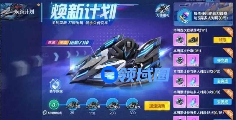 焕新点在累计达到35、110、200、300的时候可以分别领取到绝影刀锋的15天、30天、90天以及永久使用期限。
