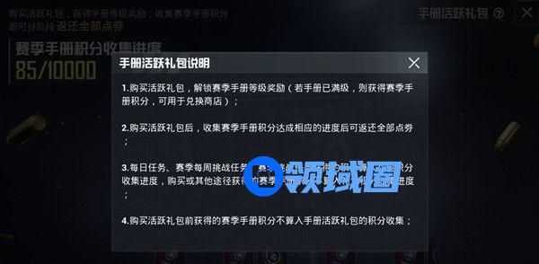 对于有活跃度保障的玩家来说,可以考虑先购买手册(但不先做任务)和第一阶段的活跃礼包,后续做任务来填充活跃礼包的积分进度,满了之后用返还的点劵购入下一级活跃礼包,这样正常肝完手册之后奖励不会少,用于购入礼包的点券也会全部返还,还能额外拿到许多军需币奖励。