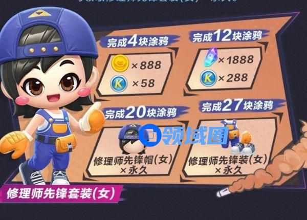 涂鸦大师的参与方式非常简单,车友们只需要完成登录游戏、参与多人对局、与好友同跑即可获得填色次数,填满一定数量的色块会获得金币、酷币和能量水晶等奖励。填满20块色块可以获得修理师先锋帽(女)、填满27块色块可以获得修理师先锋装(女)。
