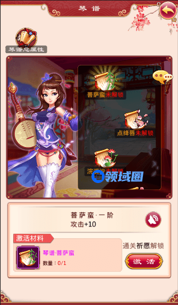 琴谱可通过消耗琴艺值进行联系,提高对应属性的值;