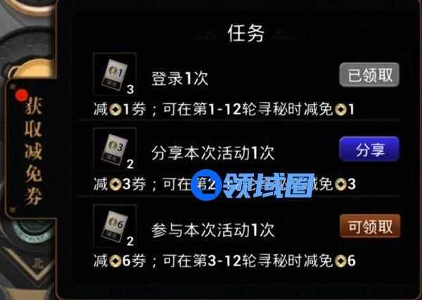 在游戏中玩家只需要将对应的活动页面分享出去,就能获取,并且在你上线签到后,就能直接获取到3张1玉币的减免券哦。
