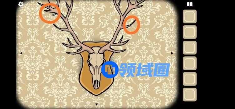 先点击墙上的鹿头,点击头骨右侧即可长出角。之后点击右边圆圈处,让左边的角也长出来。最后即可在鹿角左上方得到迷迭香,同时从鹿头鼻子出不断滴下不明液体,不过我们没有容器接取。