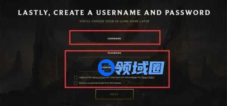 最后一步的操作比较重要,在第一个方框中输入:用户名,在第二个方框中输入:密码和 确认密码,之后在把申请的规则和游戏说明的两个框框打勾,最后在点击NEXT,账号就注册 号了。(注意:名字不能是中文,不能重复,这里注册的是账号,不是游戏名称。)