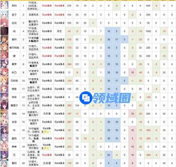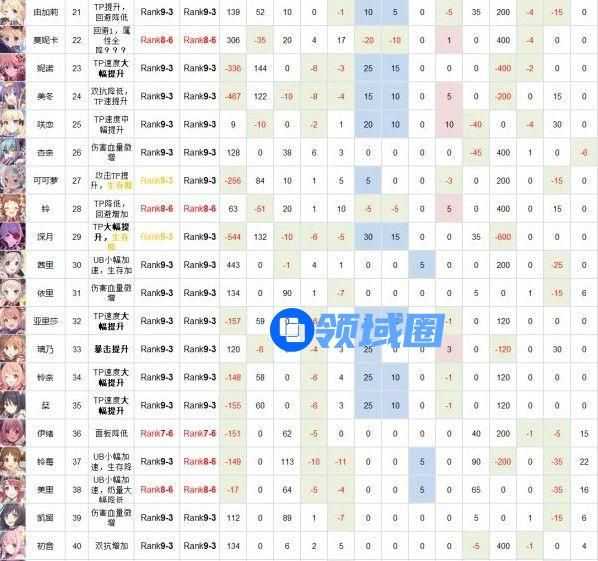 惠理子:物攻增加、TP上升增加,输出大幅提升。但双抗下降、生命值降低,坦度下降,病娇本来就脆,升Rank后更脆,请根据自身练度决定是否升R9。