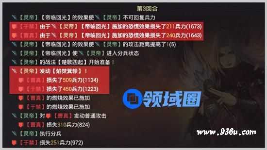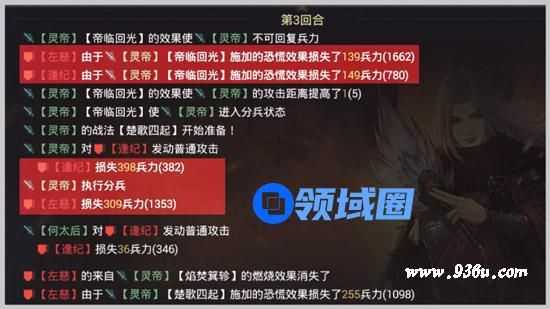 灵帝的技能作为一个后手的技能,注定了要打满8回合,前3回合输出能力低下,3回合后输出能力高速攀升。技能的属性非常不错,相当于3个技能组成,即【远攻强化】+【分兵】+【恐慌】。看似技能输出数值低下,但其实由于其多样性的组合,及稳定性的发挥(100%发动),所以能让灵帝持续不断的暴力输出。
