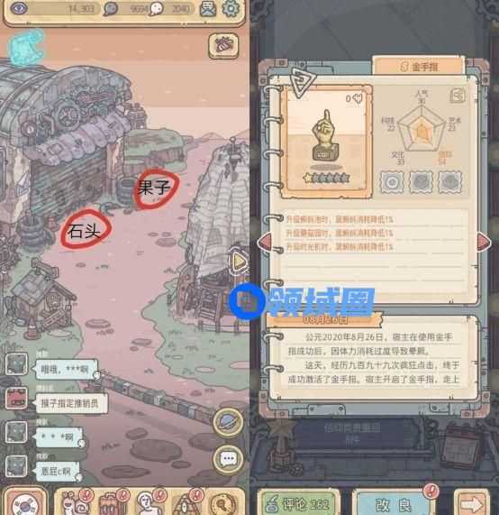 我们地图从左往右一一道来,首先在最左边大铁门的前面会有一个石头,玩家需要将这个石头手动点击1000次,即可获得一个橙色贵重品-《金手指》(1000次没有连点器的我差点把手指嗯抽筋了)并且在地图上方地上经常会有一个果子,点击后就会获得食物,食物可用于探索补给