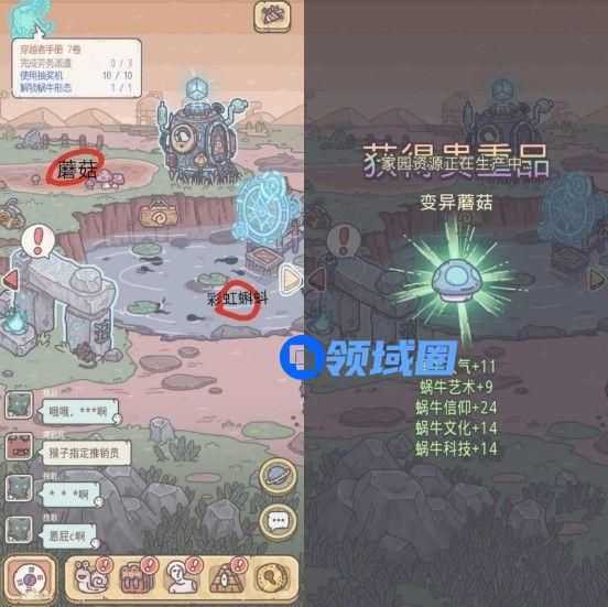 第二场景中在蘑菇生产的中心位置会有一个格格不入的蓝色光环在土里猫着,玩家需要手动点击几次后这个蓝蘑菇就会被我们的时光机一道闪电劈成炭烤蓝蘑菇,这时候再次点击玩家就会获得绿色(锅中品)-《变异蘑菇》