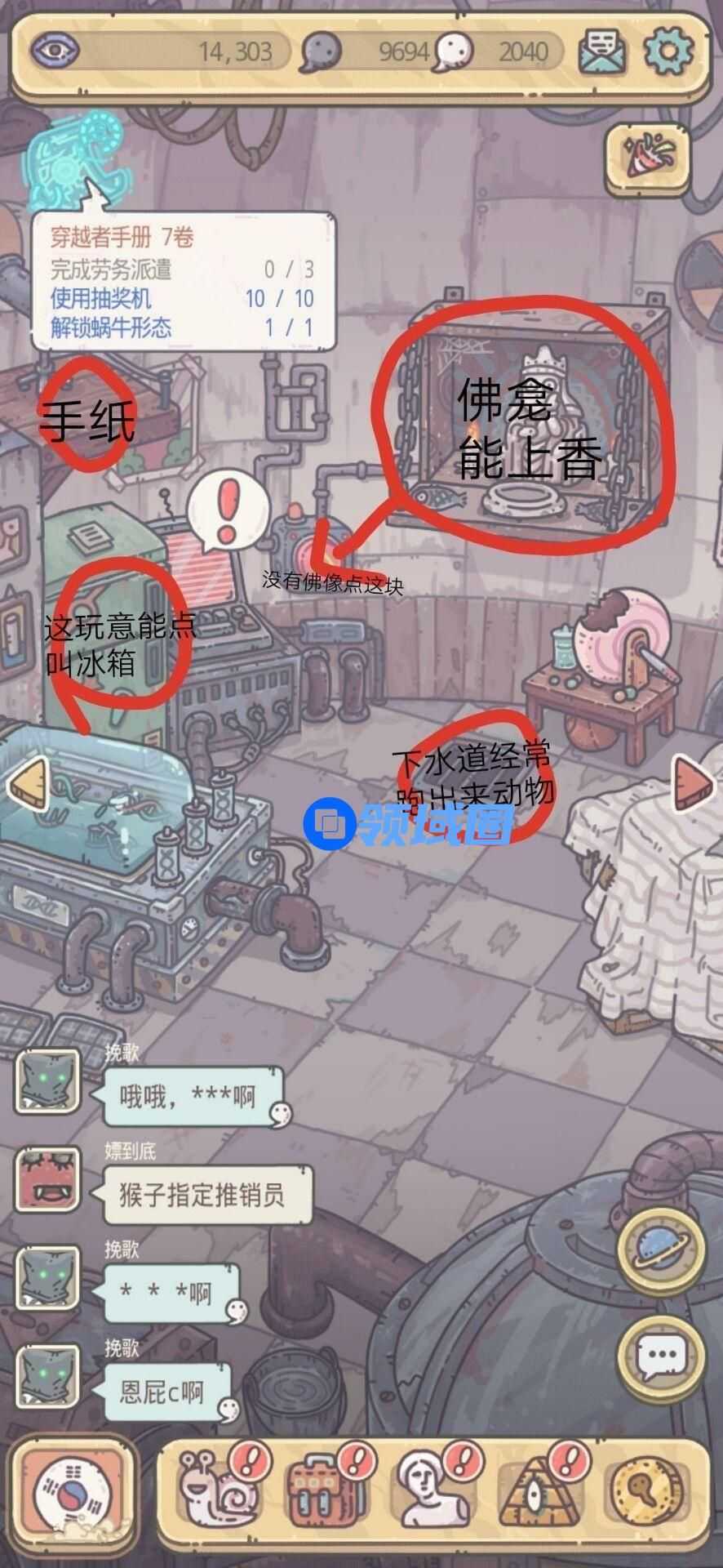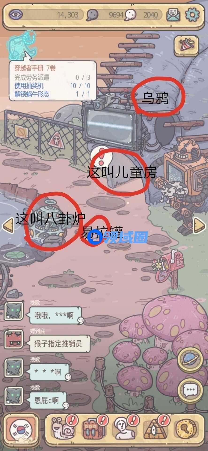 第三场景中玩家在高丽结交小伙伴顶罐子蜗牛后解锁八卦炉(可用许愿币进行贵重品抽奖许愿),和儿童房(可用于提升蜗牛兵种等级以及劳务派遣),右上方经常会有一只乌鸦,手动点击可以获得一张抽奖券或者食物(主要看乌鸦的口中是否叼着东西),中间位置的易拉罐也可手动点击获得奖励
