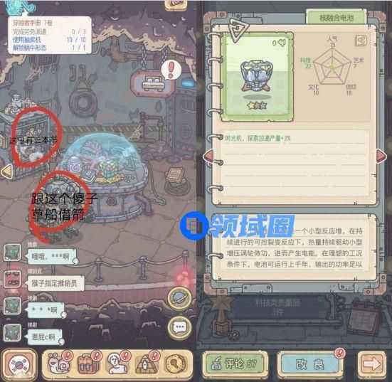 第五场景中左侧的小柜子点开后下方的第三本书中有着专属的6条密令各位老爷们不要忘记领取,第一本书中的投资收益不需要过早支付白蝌蚪,只需要当战力够时在点击投资即可立即获得白蝌蚪奖励,中间的机器人在打不过之前可以与其对话选项依次为你是干嘛的?—你看守什么东西?—你在这里多久了?—你不用换电池吗?—你可以借我看看么?将机器人的电池草船借箭过来(我凭本事借的电池凭什么还你)获得绿色贵重品-《核融合电池》,在击败看守机器人时会获得一大堆其看守的物品(大概能击败的战力在3w5或4w2以上),有电气锤、和三节棍随便打