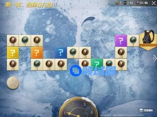 上图所示是蓝线的第一关,看到这张图后我有点懵。光子也忒会玩了吧,硬是在和平精英里面建造了一个闯关小游戏。玩家在前进的时候走到哪个格子上面就会获得相应格子的奖励,从图片中我们可以看到有物资币,有服饰币,还有带问号的格子。这些问号格子是什么意思呢?